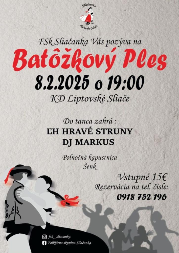 FSK Sliačanka Vás pozýva na Batôžkový Ples, ktorý sa uskutoční 8. februára 2025 o 19:00 v KD Liptovské Sliače. Do tanca zahrá ĽH HRAVÉ STRUNY a DJ MARKUS. Počas akcie bude podávaná polnočná kapustnica. Rezervácia na tel. čísle: 0918 752 196. Vstupné je 15€.