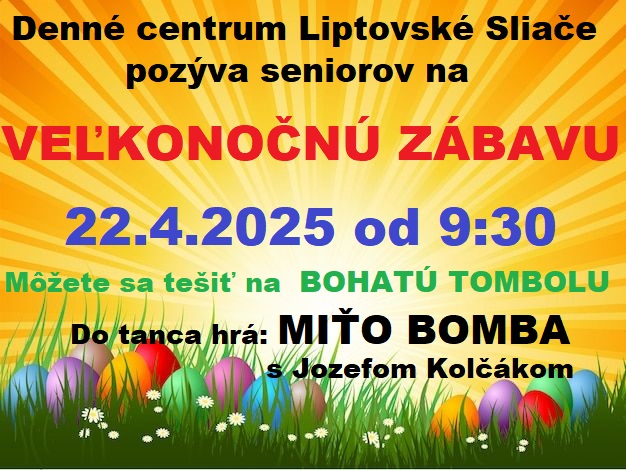Denné centrum Liptovské Sliače organizuje podujatie pre seniorov, kde si môžete užiť zábavu a bohatú tombolu. Akcia sa uskutoční 22. apríla 2025 od 9:30. Nezmeškajte túto príležitosť stráviť čas s priateľmi a vyhrať ceny! Do tanca hrá Miťo Bomba s Jozefom Kolčákom.
