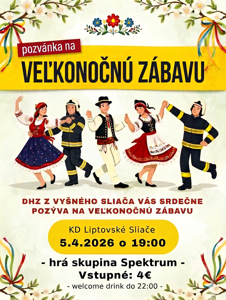 Dobrovoľný hasičský zbor z Vyšného Sliača vás srdečne pozýva na Veľkonočnú zábavu, ktorá sa uskutoční 5. apríla 2026 o 19:00 v kultúrnom dome v Liptovských Sliačoch.