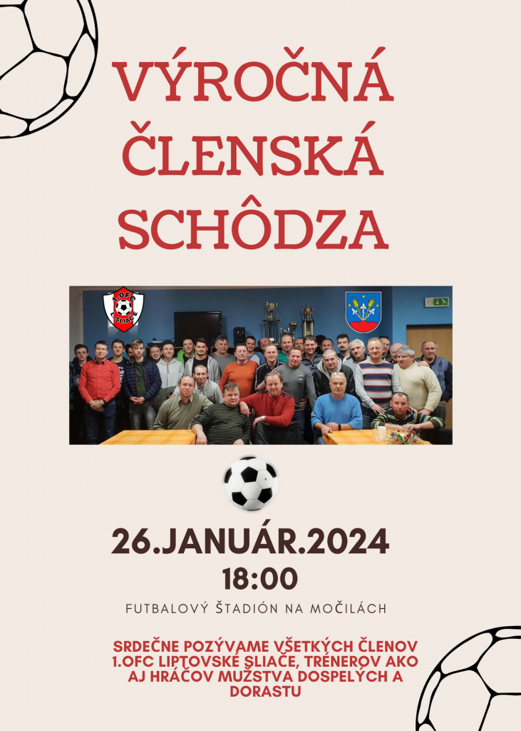 dňa 26.01.2024 o 18:00 sa v priestoroch zasadačky futbalového ihriska uskutoční výročná členská schôdza 1. OFC Liptovské Sliače