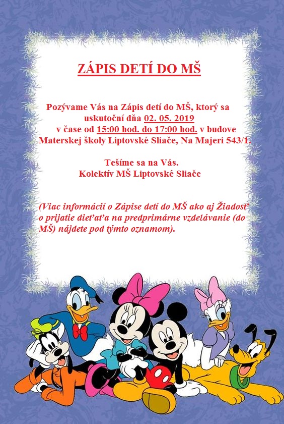 Materskej školy Liptovské Sliače na školský rok 2019/2020.