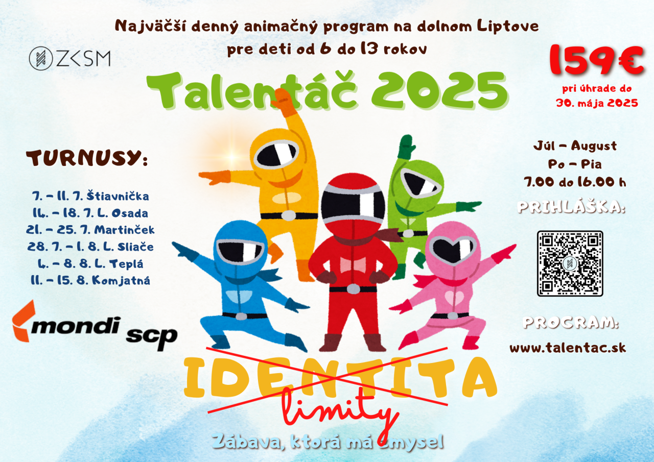 Aj toto leto hľadáme talenty, preto sa pridaj k nám a zaži každý deň program plný zábavy, hier a zážitkov. Pre deti bude zabezpečená strava, výlety a vyškolení animátori.